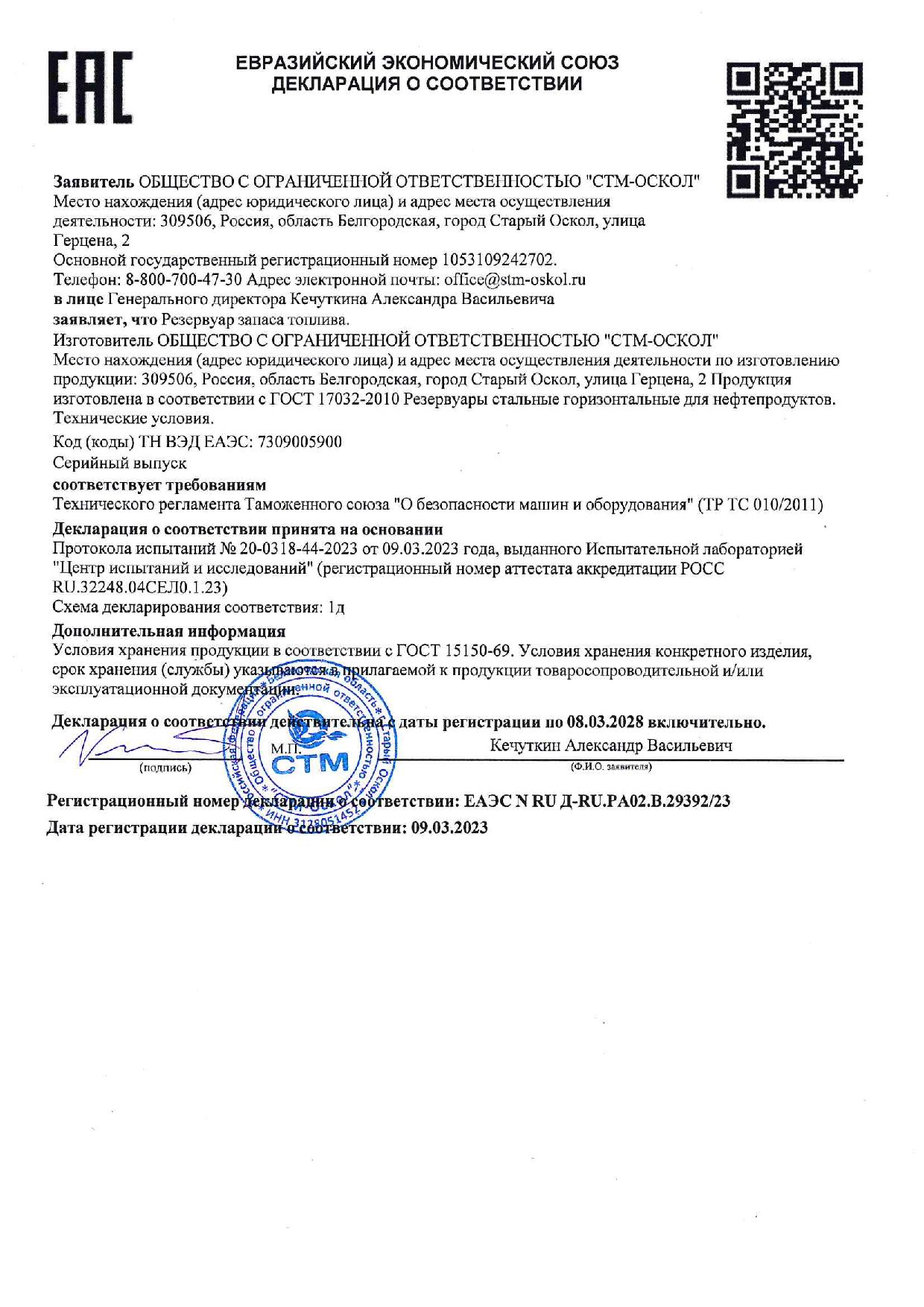 Декларация Резервуар запаса топлива